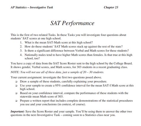Read Online AP STATISTICS INVESTIGATIVE TASK CHAPTER 23 SAT PERFORMANCE ANSWER KEY Doc
